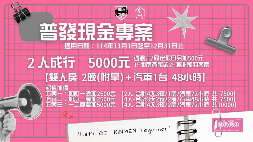 ‼️注意事項‼️ 普發現金專案 適用日期:114年11月1日起至12月31日止 2人成行 5000元 遇週六/國定假日另加500元 1F閩南燕尾或2F浯洲飛羽套房 歡迎來電訂房082-325722 1 […]
